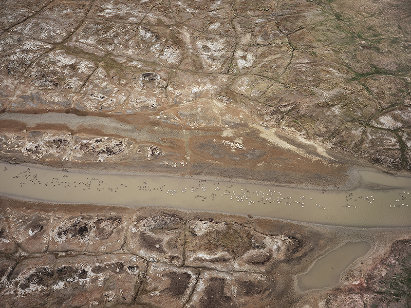 Brant and Snow Geese with Chicks | Oil and the Geese | 2006 | 68 in. x 86 in. July 2006, Teshekpuk Lake wetland, along the Beaufort Sea coast, Alaska. The Teshekpuk Lake and its surrounding wetlands in the north–central Alaskan Arctic is the largest wetland complex in the circumpolar North. These Arctic wetlands provide habitat for molting geese from three nations (Mexico, Canada and Siberia) and nesting birds from six continents. As many as 37,000 brant geese—up to 30% of all Pacific brant—gather each summer to molt north and east of the lake. These geese come from elsewhere on the North Slope of Alaska, the Yukon–Kuskokwim Delta to the south, the western Canadian high Arctic, and Siberia. Numbers of greater white–fronted geese molting at Teshekpuk Lake are increasing and range as high as 35,000. These geese are part of the mid–continental population, wintering in gulf coastal states and Mexico. Thousands of Canada and snow geese also gather to molt in the safety of this unique wetland complex. President George W. Bush’s administration made a strong effort to open up the entire 1.7 million acres of the Teshekpuk Lake special area to oil and gas development. The Iñupiat people of the North Slope who depend on this wetland oppose development in the most sensitive caribou and geese habitats. In addition to the threat of development, the international scientific community is projecting serious impact on many bird species from climate change, as important breeding and nesting areas are projected to decrease sharply as the tree line advances northward, encroaching on the tundra, and because the timing of the birds’ arrival in the Arctic might no longer coincide with the availability of their insect food sources. At the same time sea level rise will erode tundra extent from the north, further shrinking important habitat for many species. Due to the efforts of conservationists, the Teshekpuk Lake Special Area continues to remain free of oil development. |