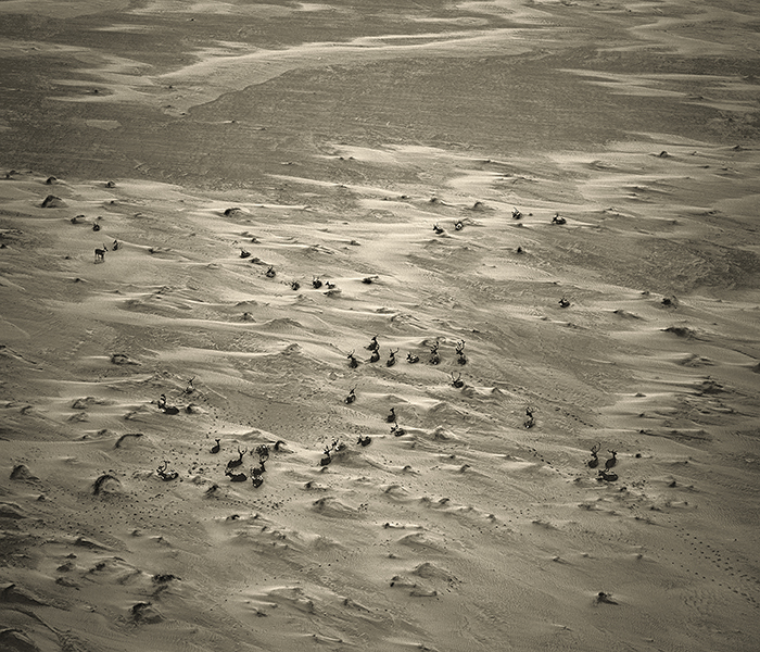 Caribou on Sand | Oil and the Geese | 2006 | 62 in. x 70 in. July 2006, Teshekpuk Lake wetland, Alaska. The Teshekpuk Lake wetland supports a relatively small but culturally significant caribou herd. Most concentrated calving activity for the 45,000–animal Teshekpuk Lake herd occurs south, east and northeast of the lake. After calving, the caribou move to the coastal habitats east, north and northwest of the lake, seeking relief from swarms of biting insects. This is one of the most important caribou herds for subsistence harvest by the Iñupiat people of Atqasuk, Barrow, Nuiqsut and Wainright. |