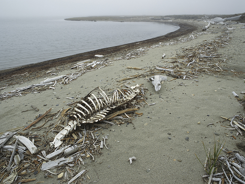 Caribou Skeleton | Oil and the Caribou | 2006 | 59 in. x 74 in. August 2006, Barter Island, Arctic National Wildlife Refuge, along the Beaufort Sea coast, Alaska. Nearly a thousand caribou from the Teshekpuk Lake herd came over to the Arctic National Wildlife Refuge, making a two hundred and forty miles journey during the winter of 2006. Robert Thompson, an Iñupiaq conservationist who lives in Barter Island and accompanied me to the site speculated that perhaps the tundra in the Teshekpuk Lake wetland froze and the caribou came over looking for food. The tundra in Barter Island also froze, resulting in death of several hundred caribou that winter. I photographed the skeleton of such an animal the following summer. In recent years, there have been instances of rain during autumn and winter months in the Arctic, when the temperatures normally remain well below zero. The rain, followed by freezing, is causing hard ice crust on the tundra, which affects many land animals by encapsulating their food in ice, severely limiting forage availability. Caribou/reindeer, musk ox, lemmings are all affected; dramatic population crashes resulting from ice crust have been reported in some areas, and the frequency of these freeze–thaw events appears to have increased over recent decades, a consequence of anthropogenic climate change. |