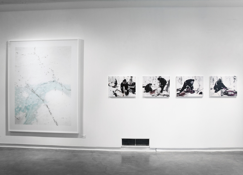 Installation View | Artist–in–Residence exhibition, Jaffe-Friede Gallery, Hopkins Center for the Arts, Dartmouth College | 2009 There are three points of tension intended in the juxtaposition of the migration and the harvest images: nature / culture; image scale / viewing distance; and attraction / repulsion. In my introduction in Arctic Voices: Resistance at the Tipping Point, I wrote: On seeing my photos of hunting/butchering during lectures and in exhibitions in the US and in Europe, audiences have expressed a feeling of unease. In fact, during the 2009 UN Climate Conference in Copenhagen, a United Nations Environment Programme (UNEP) representative told me, “I wish you had not shown these hunting photographs here in Copenhagen.” She was referring to Gwich’in caribou hunting photos that I had taken near Arctic Village, in January 2007. |