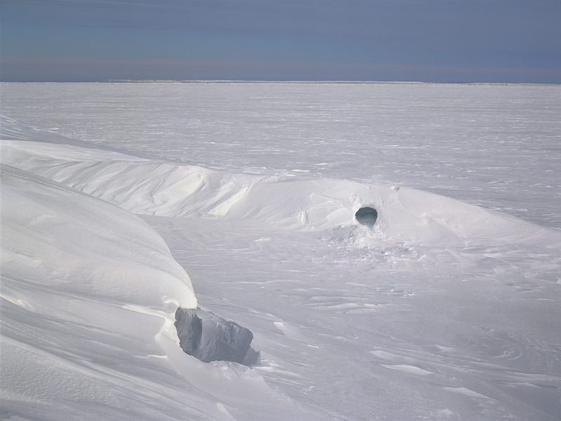 Bear Den II | Oil and the Caribou | 2002 | 68 in. x 86 in. Late March 2002, Arctic National Wildlife Refuge coastal plain, Alaska. The Arctic National Wildlife Refuge coastal plain is the only land conservation area in the United States for denning polar bears. The Arctic sea ice has been melting at an unprecedented rate due to anthropogenic climate change, which is having devastating impact on marine species that critically depend on sea ice, including polar bears, walrus, ringed seals and seabirds. As the sea ice melts and progressively become thinner, the bears come to rely more on land dens. Pregnant females go in these temporary dens in October–November; give birth during December–January; and nurse their cubs inside the den until March–April, at which point they emerge from the dens with usually one or two cubs. At that time, the mothers have not eaten for five to seven months and critically require good spring sea ice for seal hunting to feed themselves and to nurse their cubs. The oil companies have been pushing hard to open up both the coastal plain of the Arctic Refuge for onshore and the Beaufort and the Chukchi Seas of Arctic Alaska for offshore oil and gas development. Such industrial projects will only exacerbate the fate of the polar bears. |