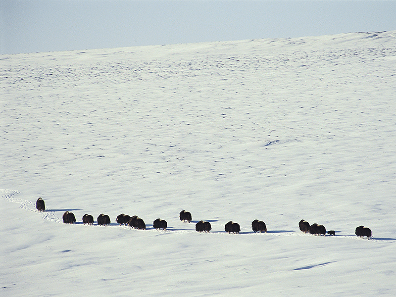 Musokox with Calf | Oil and the Caribou | 2001 | 18 in. x 24 in. Early May 2001, foothills of the Brooks Range Mountains, along the Canning River, Arctic National Wildlife Refuge. Fourteen adult muskox and a newborn calf, likely a day or two old, migrate from the foothill of the Brooks Range Mountains to the coastal plain. In my first book, Arctic National Wildlife Refuge: Seasons of Life and Land, I wrote: “During the past several years, the coastal plain experienced deeper snow and a later spring thaw than usual, a phenomenon scientists believe is the result of climate change. The deep snow has severely impacted several species at the Refuge, of which the most notable are the caribou and the muskox. When the snow is deep on the coastal plain, muskox find it difficult to forage for food and move to the foothills, where they can feed on willow twigs and other growth on the windblown ridges. However, during calving time (mid–April to mid–May) they are vulnerable to grizzly predation in the foothill areas and must go to the coastal plain to protect their calves.” Besides deeper snow, there is winter rain (another recent climate change phenomenon in the Arctic) followed by freezing, which creates hard ice crust on the tundra that muskox is unable to break through to find food. By the time my second book, Arctic Voices: Resistance at the Tipping Point was published in 2012, all the muskox were gone from the Arctic National Wildlife Refuge. |