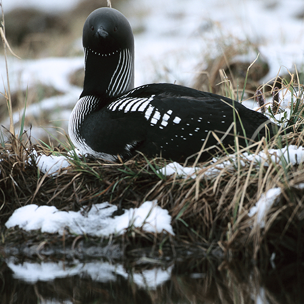 Loon on Nest | Oil and the Caribou | 2002 | 12 in. x 12 in. Late June 2002, Arctic National Wildlife Refuge coastal plain, Alaska. In my essay in the Third Text journal special issue, “Contemporary Art and the Politics of Ecology,” I wrote: In these bird portraits we do not get much information about their natural history but instead a psychological state of being–in–the–land. The loon sleeps briefly, then wakes up, and rotates its head to look around. … I surmise that the loon (besides being curious) was keeping an eye out for predators, like the Arctic fox, that would try to get the eggs—at times the fox wins. … Loons critically depend on large deep lakes—both for access to food and as transportation corridors. … Arctic lakes are disappearing rapidly due to warming—permafrost is thawing and the water is draining away, leaving the lakes dry. Beyond the tundra there is no more land or lakes, only ocean, all the way to the North Pole. Loons cannot go any further north than they currently go to nest. |