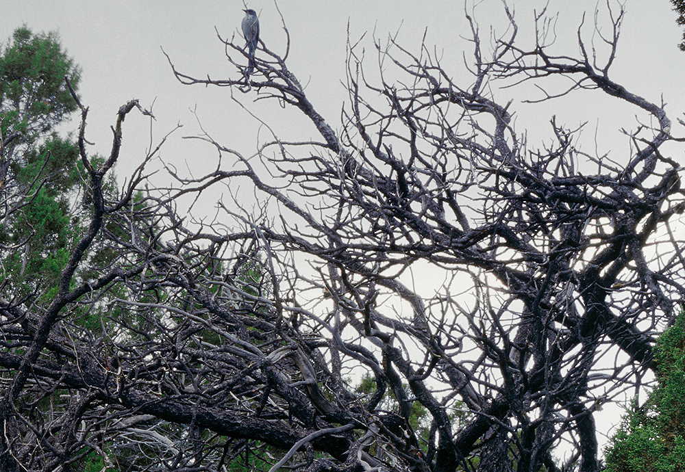 SCRUB-JAY IN THE MIDST OF MANY DEAD PIÑONS