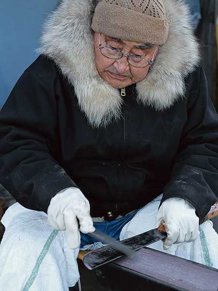 , Isaac Akootchook sharpening knives, Kaktovik, 2001