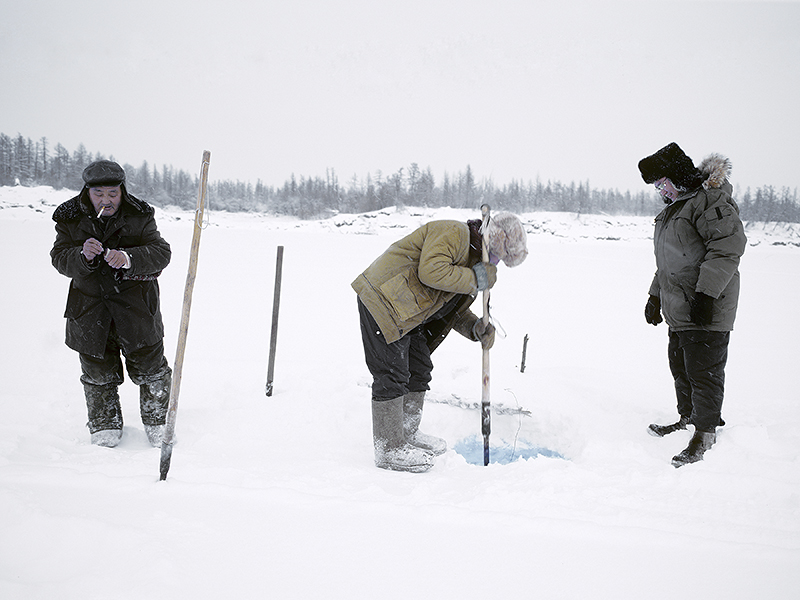 Ice Fishing—Nikolai Shalugin, Yuri Shalugin, and Vyacheslav Shadrin | Yukaghir and The Climate | 2007 | 18 in. x 24 in. November 2007, Yashachneya River, Sakha Republic, Siberia. In November 2007, on an assignment from Vanity Fair, Robert Thompson and I visited Nelemnoye, the Yukaghir community along the upper Kolyma River in the Sakha Republic of Siberia. The community depends on subsistence hunting and fishing. In addition to economic hardship due to climate change, decreased abundance and local and global extinctions of arctic–adapted fish species are projected for this century. At the end of the eighteenth century, the Yukaghir people occupied the vast and entire territory of the Sakha Republic (Yakutia), which is the largest subnational entity in the world. For many reasons, including Tsarist expansion, Sovietization, disease, and the expansion of other indigenous tribes, the Yukaghir population has declined rapidly, and today they inhabit only two communities along the Kolyma River with total population of about fifteen hundred. From our hosts, Yakutsk–based Yukaghir cultural activist Vyacheslav Shadrin (right) and other community members, we learned that they are determined to revitalize both the Yukaghir language—now spoken by about eight people—and their traditional culture. |