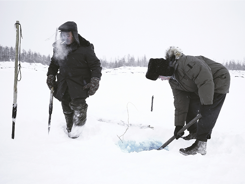 Ice Fishing—Nikolai Shalugin and Vyacheslav Shadrin | Yukaghir and The Climate | 2007 | 18 in. x 24 in. November 2007, Yashachneya River, Sakha Republic, Siberia. During our visit Nikolai Shalugin (left) mostly caught white fish, some grayling, and two lingcods, one of which he sliced in extremely thin and long strips that we ate raw, while sharing stories in his small cabin at midnight. |