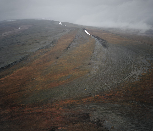 The photograph shows tracks on coal seams made by the Western Arctic caribou herd over a very long period - perhaps many centuries or even millenia. These tracks are deeply etched in the coal surface. This also means that the coal is right on the surface and any development here most likely will employ a relatively recent mining process known as mountain-top removal. This type of mining has been used in the Apalachian Mountains that spans several southeastern states of the United States. Only from air can one grasp the magnitude of the devastation, with dark craters and huge black ponds filled with a toxic byproduct called coal slurry. In the Utukok Upland it is not an issue of aesthetic, but ecology, as these vast caribou herd use this area both for calving and post calving aggregation.